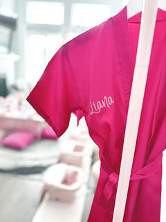 Table with floor cushions, clothes rack and spa robes*, clothes rack to display spa robes, instruction guide.